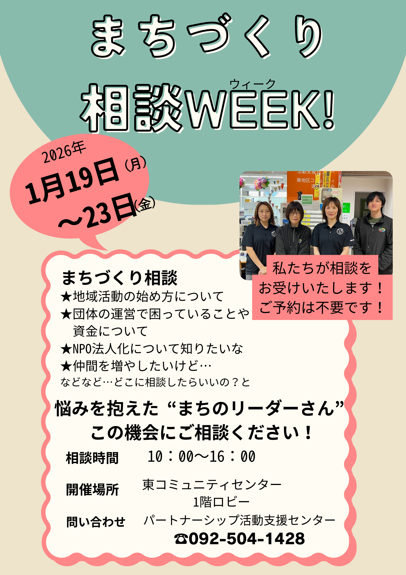 1月・2月は、東・中央・北コミュニティセンターでまちづくり相談WEEKを開催します。